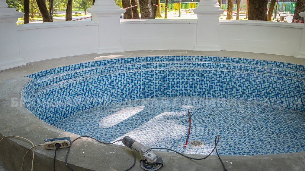 Уже покрашены колонны, а в чаше фонтана сделана укладка плитки и мозаики. Сегодня краской покроют передний и задний фасад сооружения. Специалисты займутся монтажом оборудования для фонтана, его кольца и чаши со скульптурой композицией влюбленных голубей.