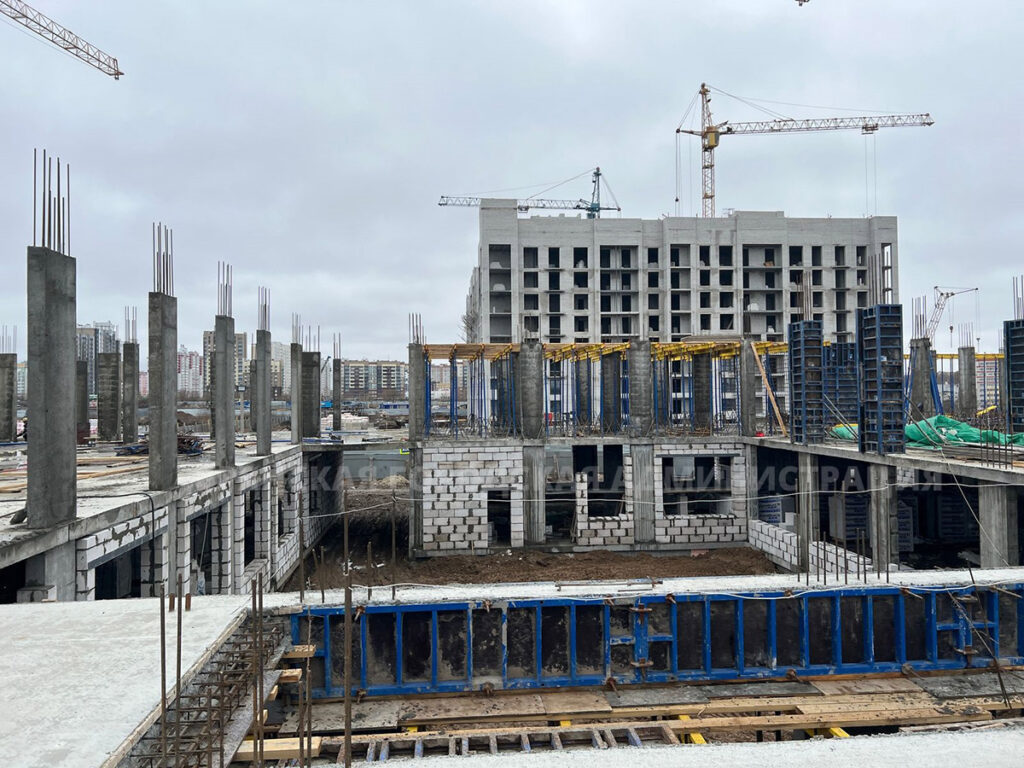 В настоящее время на объекте работают специалисты по монолитным работам. Они занимаются бетонированием колонн, пилонов и перекрытий во всех четырёх блоках. В основном работы ведутся на первом этаже, но некоторые рабочие уже переходят на второй.