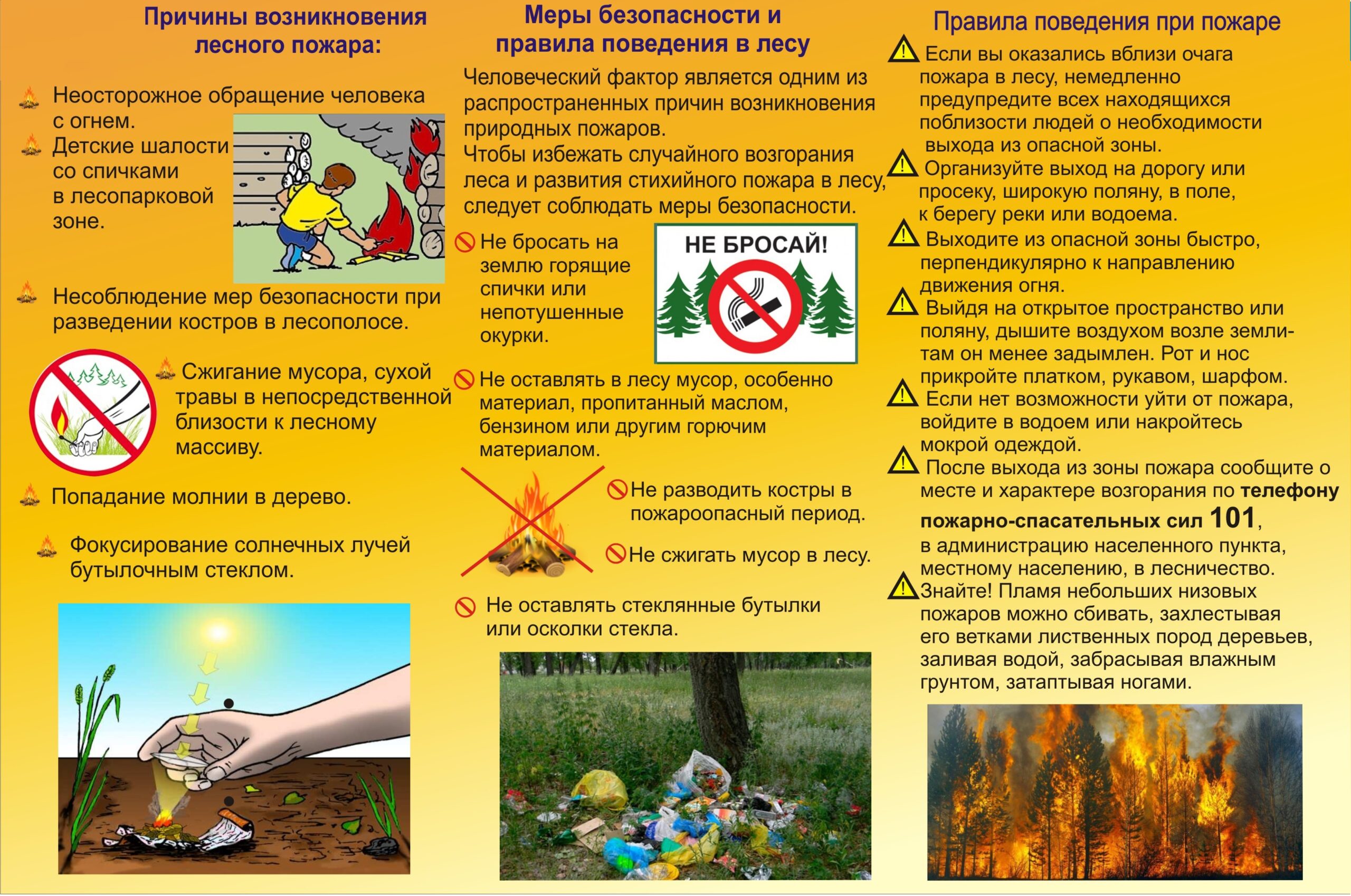 не разводите огонь вблизи деревьев и кустарников, также запрещено разводить огонь в ветреную погоду;