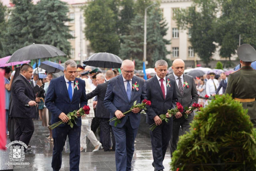 Затем руководство Гомельщины и российские делегации прибыли к Вечному огню у братской могилы советских воинов и подпольщиков. Там присутствующие возложили венки и цветы. Память о погибших в годы Великой Отечественной войны почтили минутой молчания.