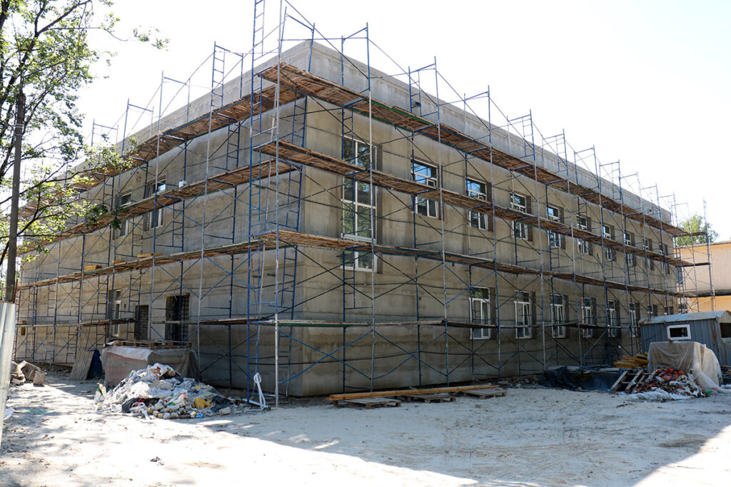 Подрядчик «Жилсоцстрой» штукатурит и шпаклюет стены на втором этаже нового корпуса, на первом аналогичные работы завершены. Также выполняется устройство вентиляции, прокладка инженерных коммуникаций. Производится внешняя отделка здания — утепление и штукатурка.