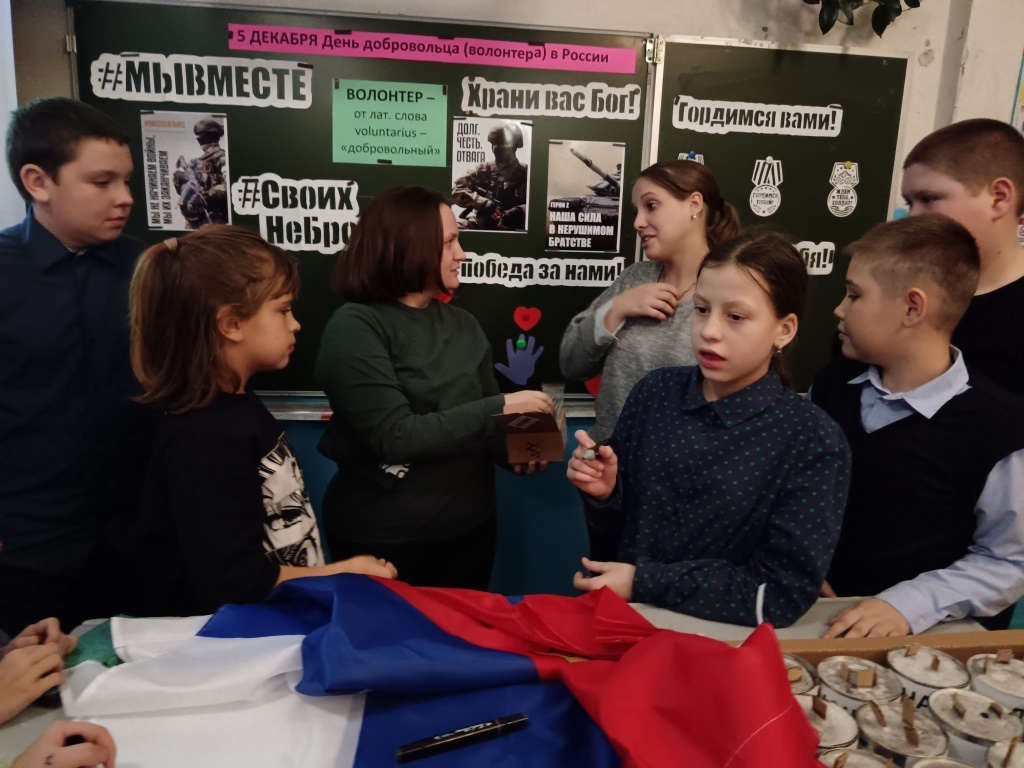 Ученики подготовили посылки и письма для солдат, а также изготовили блиндажные свечи, которые были переданы Анне Николаевне. Гостья выразила благодарность школьникам за их активную деятельность в сфере волонтёрства и отметила, что всё, что делают активные жители села и ребята, оказывая помощь и поддержку бойцам в зоне специальной военной операции, плетя маскировочные сети, изготавливая окопные свечи и отправляя посылки и письма солдатам, — всё это делается во благо народа и для нашей общей победы.