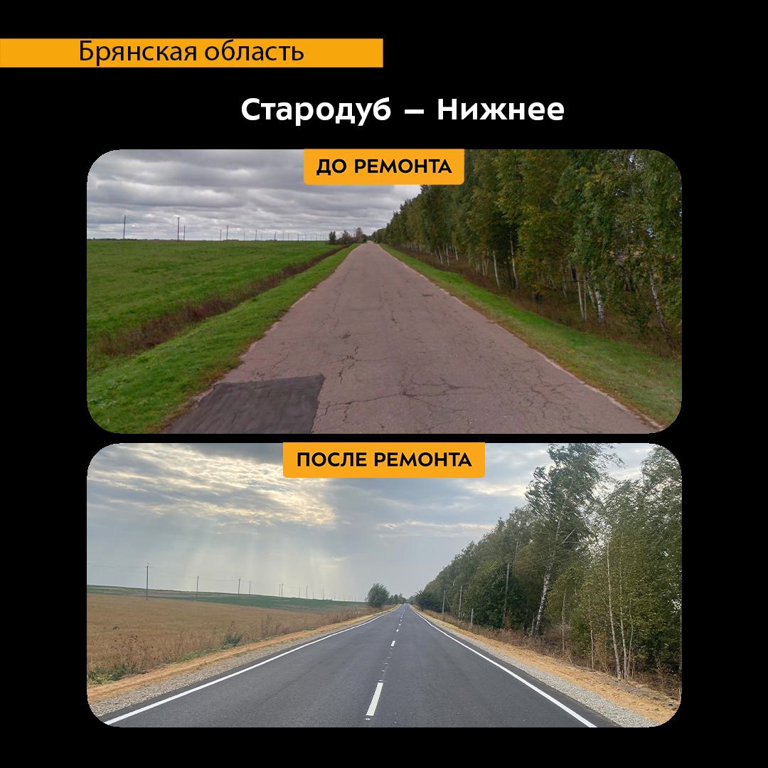 Так, в Стародубском муниципальном округе Брянской области отремонтировали участок автодороги Стародуб – Нижнее протяженностью 4,6 км. Подрядчик – АО «Дорожник».