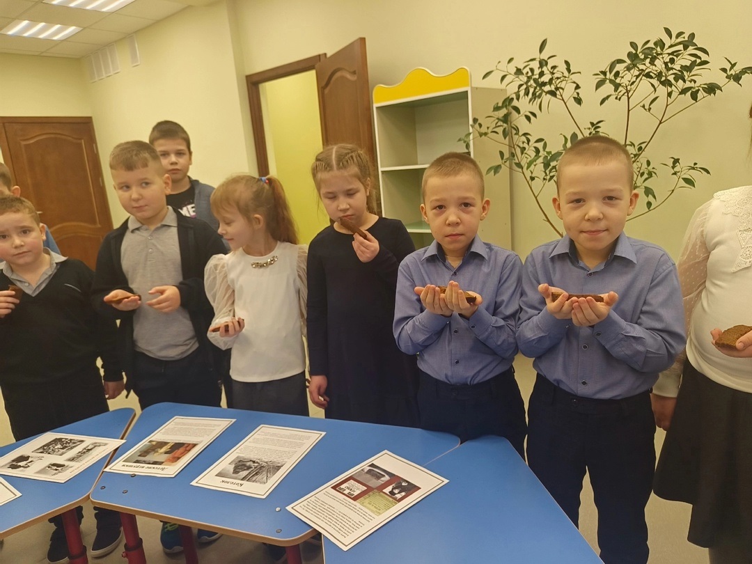 Школьники узнали, что норма выдачи хлеба в то голодное время была очень маленькой и составляла всего 250 граммов на работающего и 125 граммов на остальных. Маленький кусочек хлеба выпекался из примесей жмыхов, овсяной муки и целлюлозы, получаемой из древесины, в него добавляли хвою и коревую муку. Хлеб был горьковатым на вкус, но именно он был надеждой на жизнь в ту тяжелую военную пору. Рассматривая маленький кусочек черного хлеба, ребята удивлялись стойкости и силе духа нашего народа. «Блокадный хлеб» — это символ надежды на завтрашний день, который навечно остался в памяти ленинградцев, переживших суровые годы блокады.