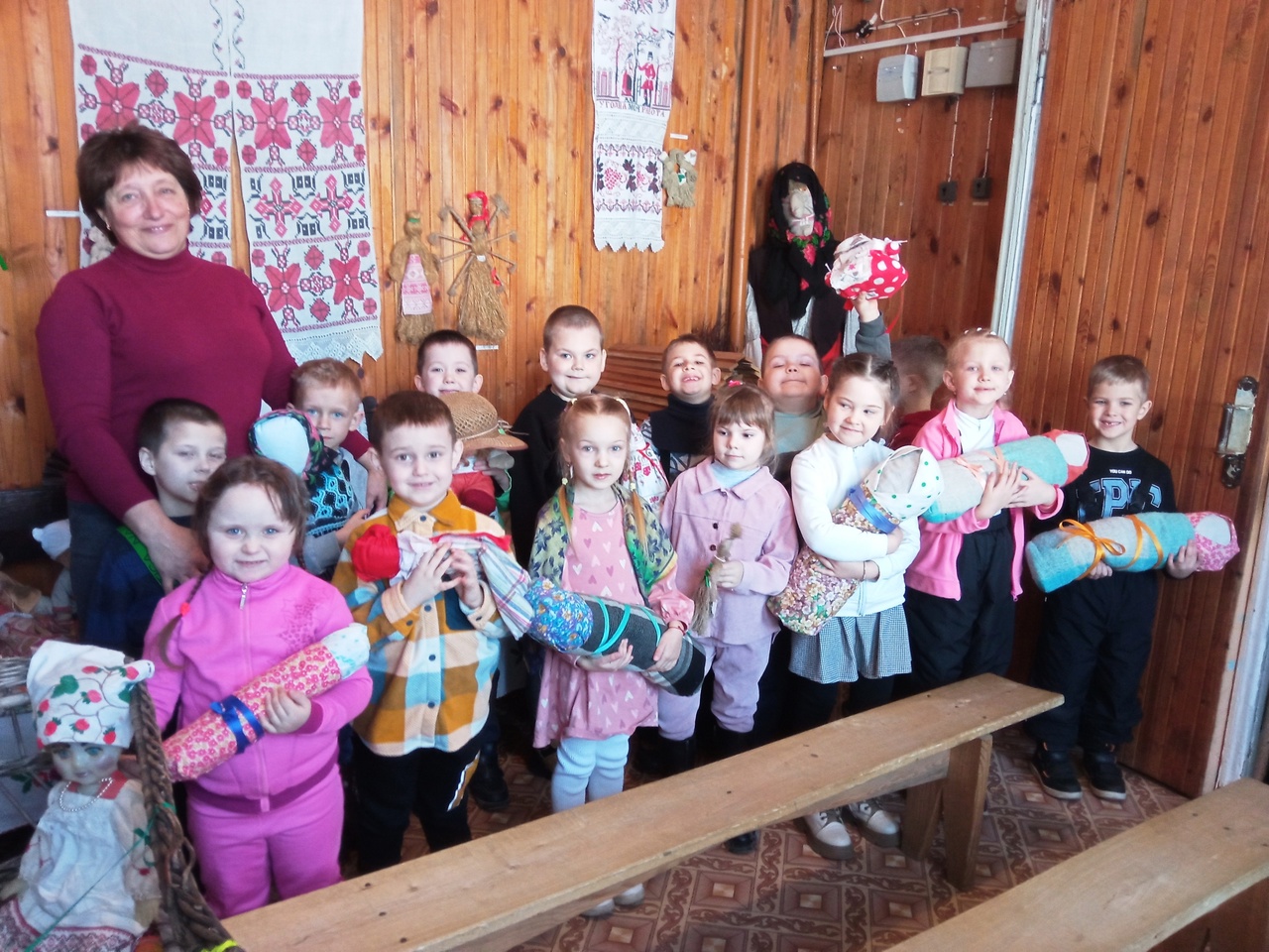 Маленькие ребятишки из детского садика «Солнышко» не испугались утреннего морозца, хотя путь был неблизким. Они устали, но очень хотели узнать о старинных народных куколках, которые не только забавляют, но и оберегают малышей. Поэтому их и называют оберегами.