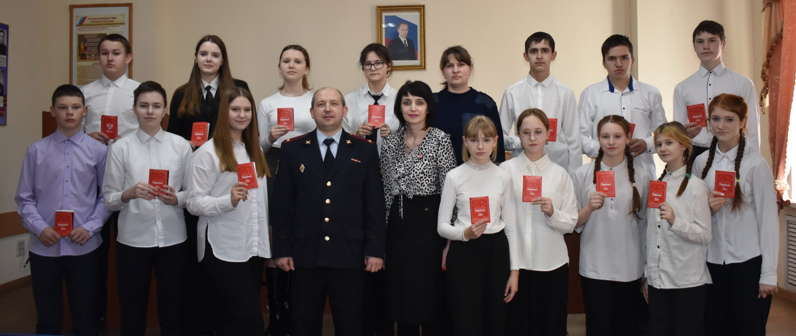В рамках Всероссийского проекта «Движения Первых» «Мы — граждане России!» в отделе полиции «Суражский» МО МВД России «Унечский» состоялась торжественная церемония вручения паспортов юным жителям Суражского района – обучающимся школ города №2, №3 и Душатинской школы, достигшим четырнадцатилетнего возраста.