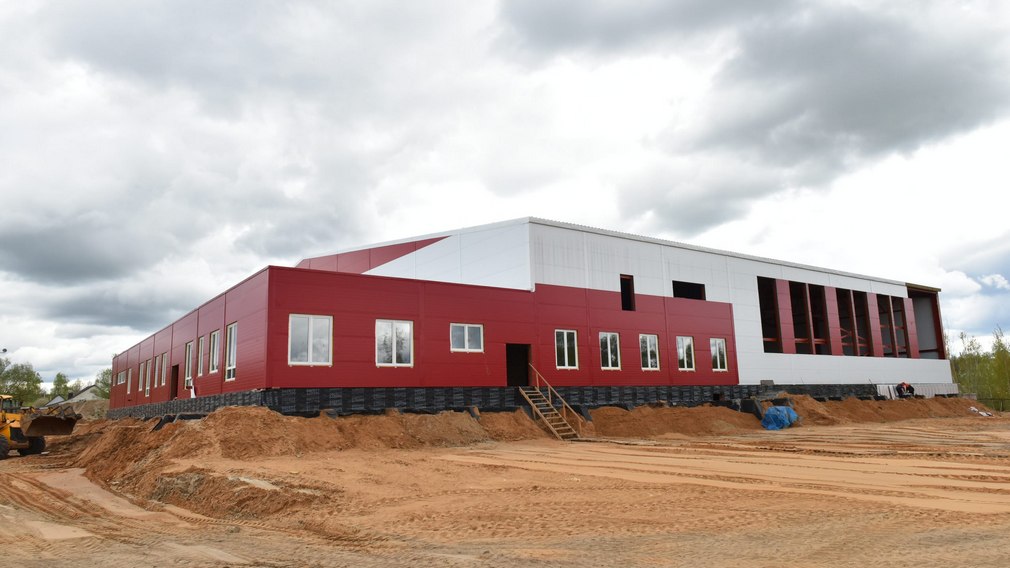 В настоящее время забетонирована чаша бассейна, смонтированы металлоконструкции и стеновые сэндвич-панели, на первом этаже установлены окна.