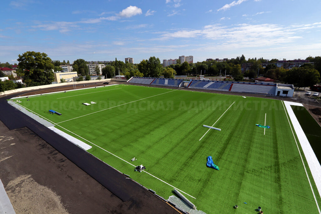 Отмечается, что на этой неделе подрядчик ИП А.С. Пигарёв завершает работу с искусственным покрытием футбольного поля. Основной зелёный ковёр уложен, параллельно раскладываются и склеиваются полосы белой разметки. Кресла для зрителей установлены на четырёх из шести секций трибун. Вокруг стадиона началось асфальтирование четырёх беговых дорожек. На них в будущем уложат резиновое покрытие. В подтрибунных помещениях укладывается плитка, разведены трассы электрики, водопровода, отопления. Полностью преобразятся раздевалки, санузлы, появятся тренерские и судейская комнаты.