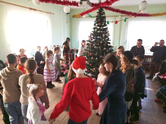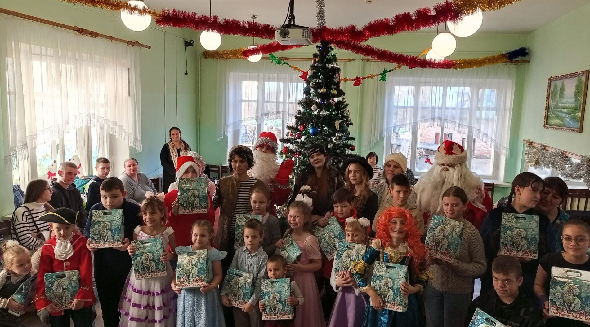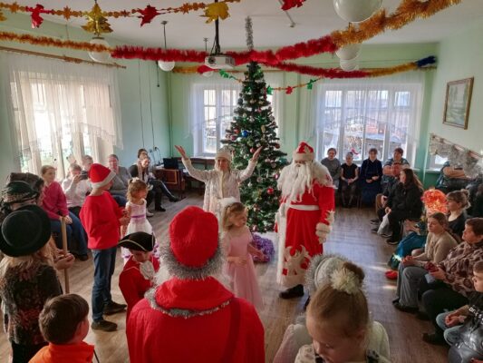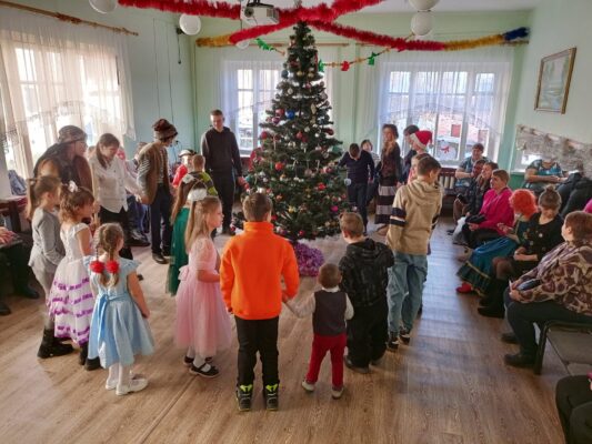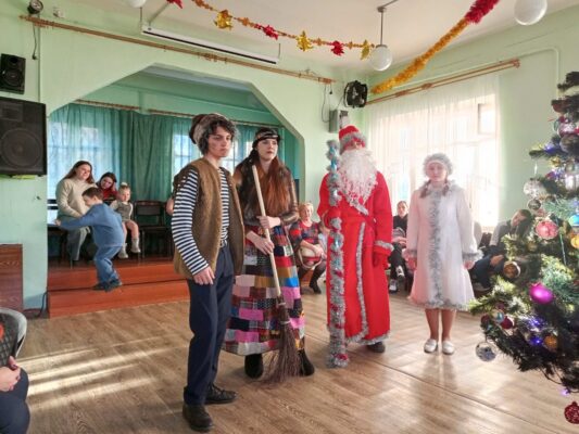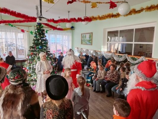 Дед Мороз (Копанин Максим), Снегурочка (Савченко Диана), Баба Яга (Зюзько Карина), Кикимора (Товпеко Алина), Леший (Пучков Евгений) подготовили волшебное, чудесное сказочное новогоднее представление. Мальчишки и девчонки окунулись в атмосферу новогодних приключений по спасению Снегурочки из заточения, которое организовали ей лесная нечисть в лице Лешего, Бабя Яги и Кикиморы. С радостью встретили самых долгожданных гостей – Деда Мороза и Снегурочку. Все присутствующие попали в новогоднюю сказку и стали её непосредственными участниками. Новогодний утренник сопровождался новогодними песнями и зажигательными танцами . В конце праздника каждый ребенок получил сладкий подарок.
